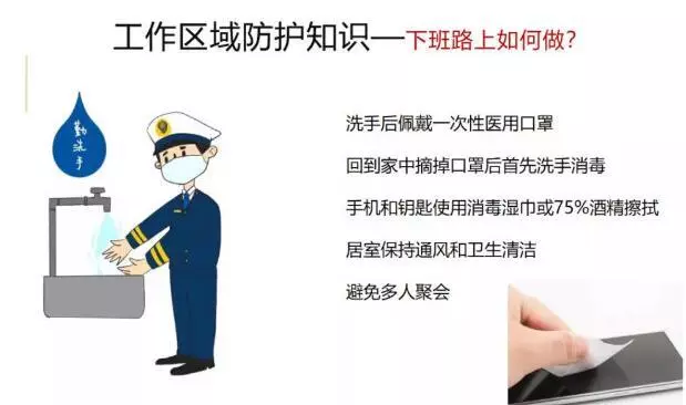 下班后第一時(shí)間洗手后佩戴好一次性口罩,回到家中摘下口罩放置到專門的密封袋后,第一時(shí)間用肥皂或洗手液洗手,工作中使用的手機(jī),蘸75%的酒精用消毒棉簽或者棉球進(jìn)行擦拭消毒,做好自己室內(nèi)/宿舍內(nèi)的衛(wèi)生清潔,單位宿舍和休息期做好每天至少三次的消毒工作,保持室內(nèi)通風(fēng),不聚會(huì)少外出。